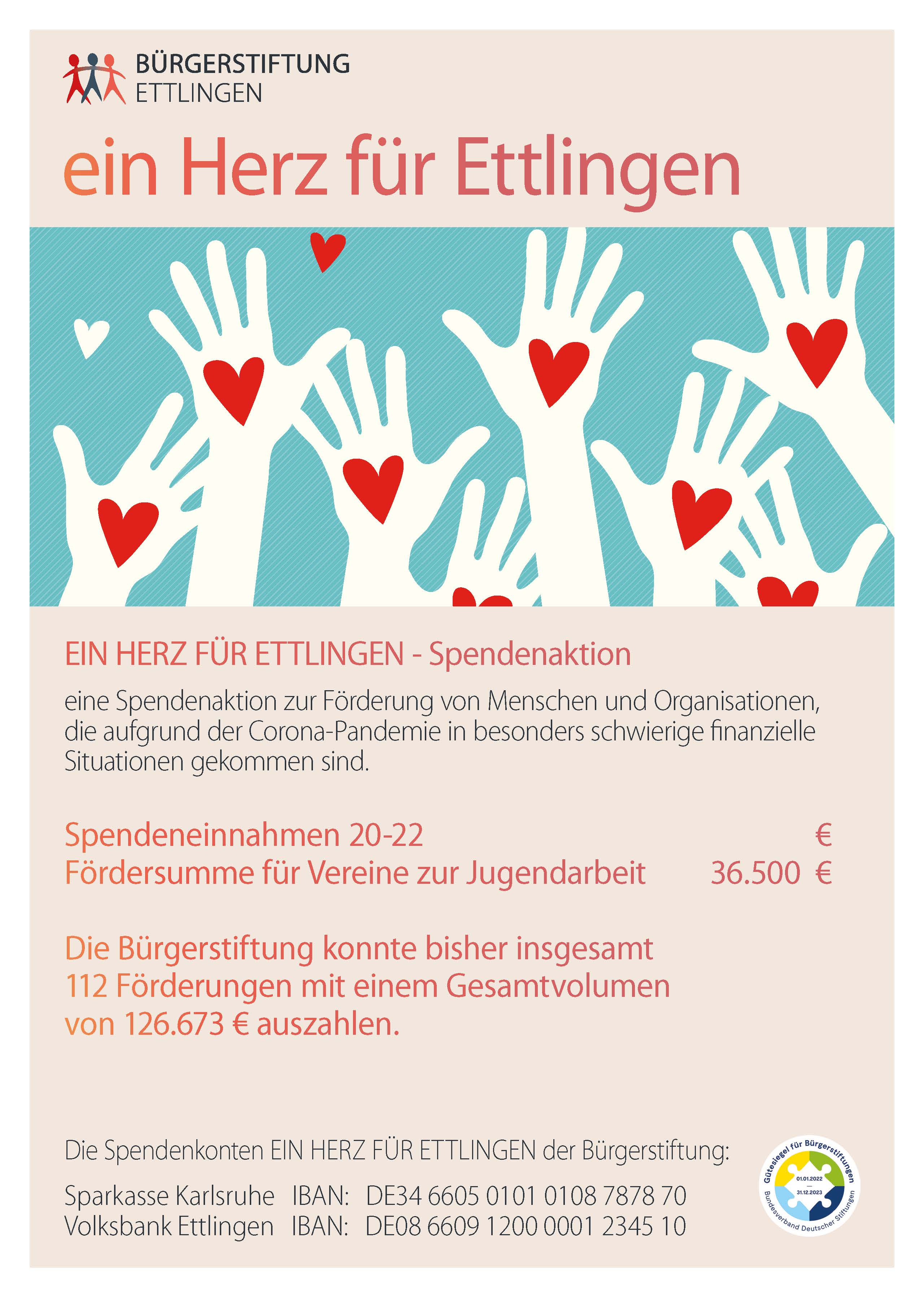 Die Arbeit der Bürgerstiftung Ettlingen wird nicht nur lokal wahrgenommen, sondern findet auch im Kreis aller Bürgerstiftungen in Deutschland positive Anerkennung. Sie wurde vom Bundesverband Deutscher Stiftungen mit dem Gütesiegel ausgezeichnet. Es ist der Garant für alle Unterstützer der Bürgerstiftung, dass ihre finanzielle Unterstützung im Sinne der Stiftungszwecke verwendet wird.